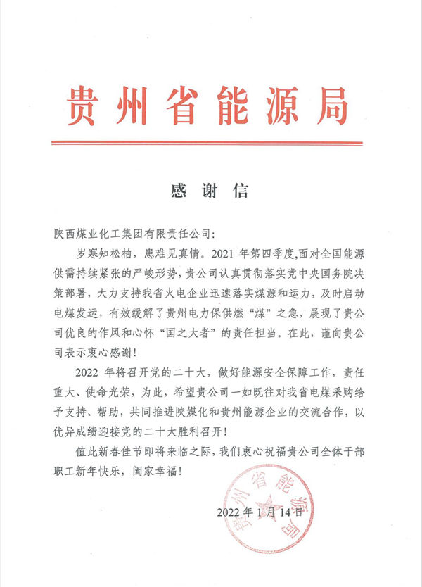 近日,陜煤集團(tuán)收到貴州省能源局發(fā)來(lái)的感謝信,信中對(duì)陜煤集團(tuán)2021年四季度給予的電煤保供支持表示衷心感謝。