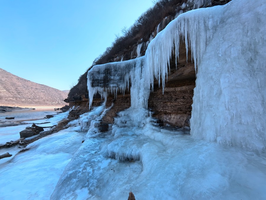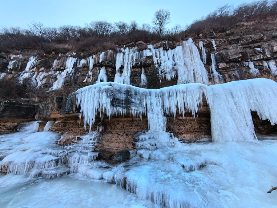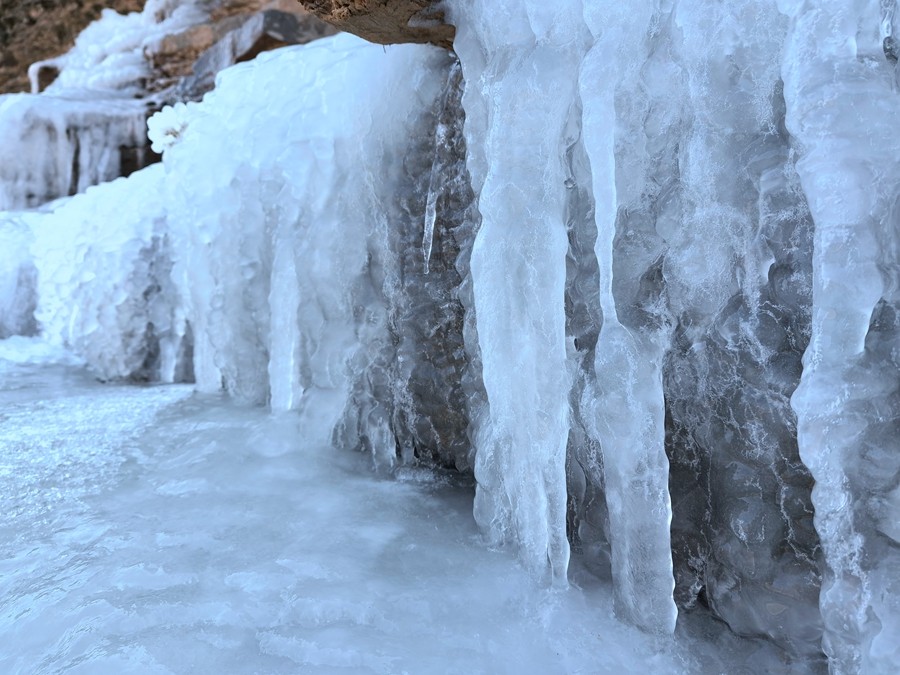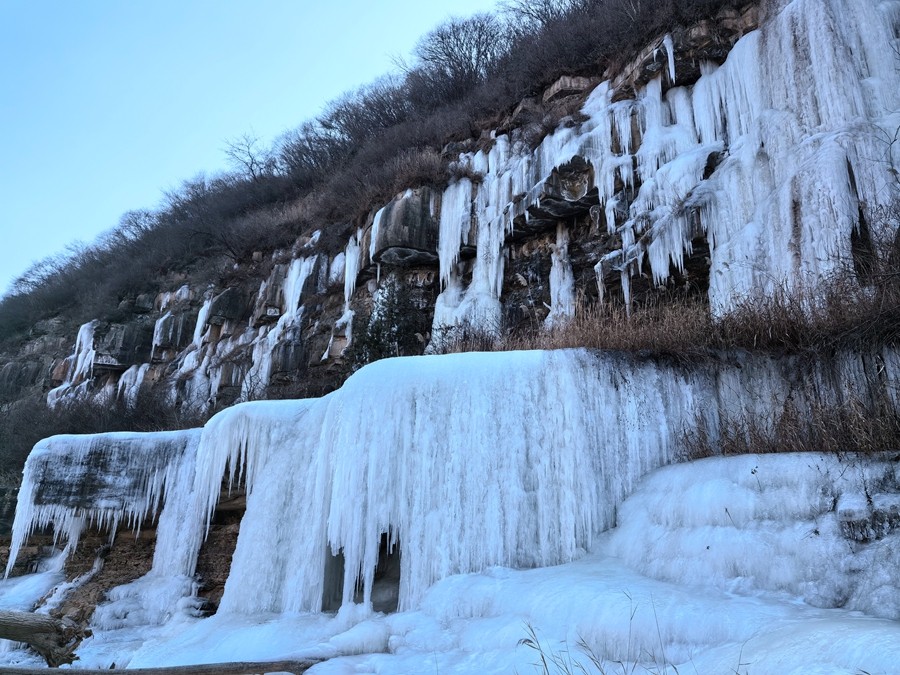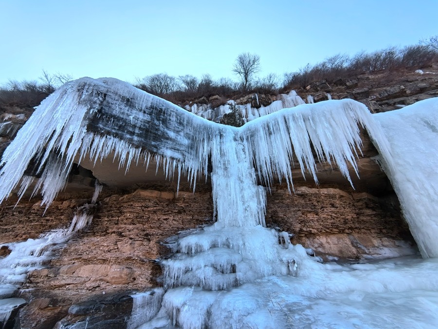冰瀑是因天氣寒冷,水流到低于零攝氏度的地表后與巖石凍結而形成的一種自然現象。氣溫驟降時,夏日里泉水叮咚的山谷中,卻點綴著一條條銀裝素裹的冰柱,往日流水潺潺的河溪凝結成潔白的“玉帶”在山間舞動,更有寬闊的巨型冰瀑高懸在崖壁之上,讓人感嘆大自然的鬼斧神工。(大佛寺礦 張洋)
