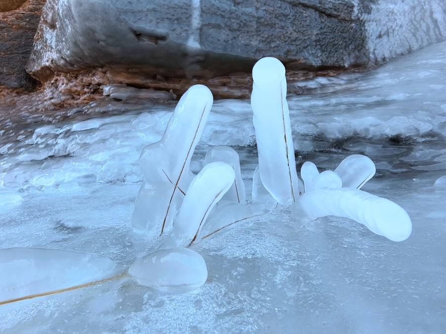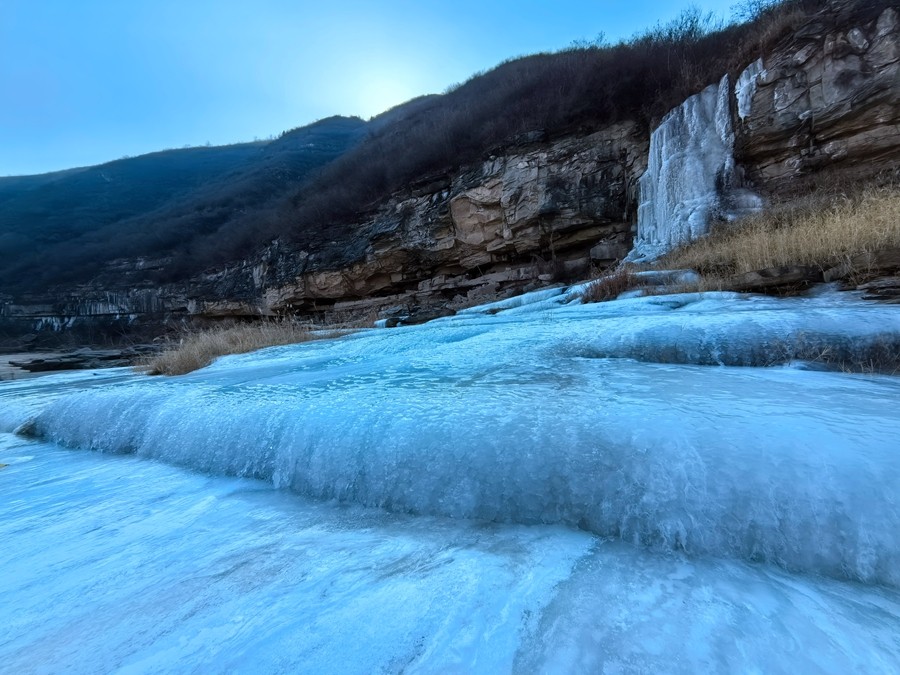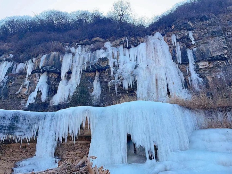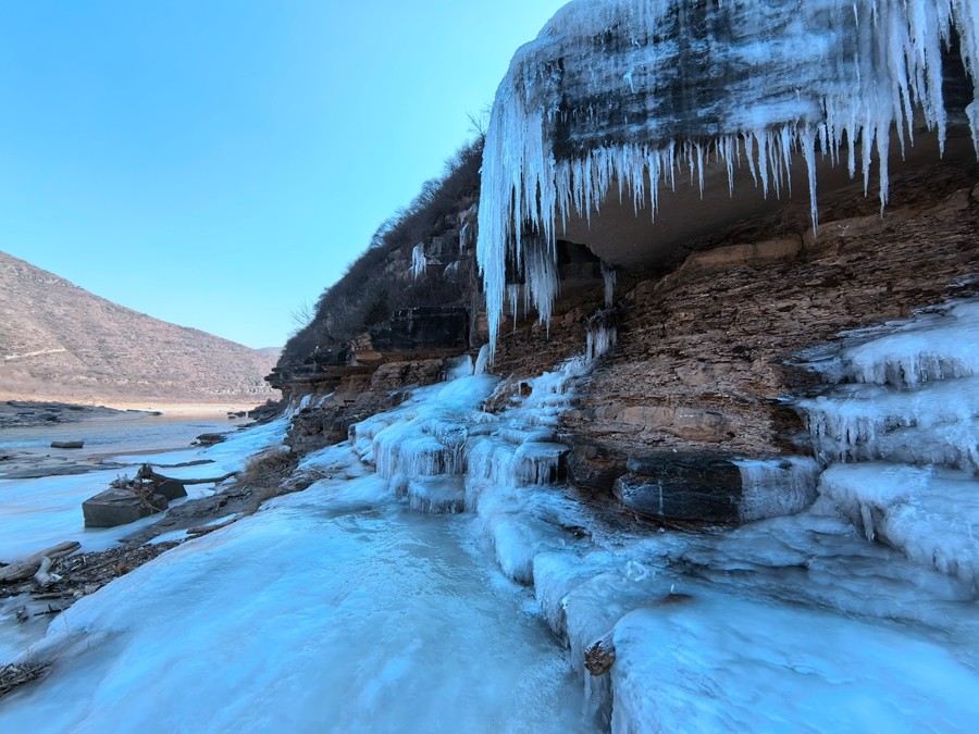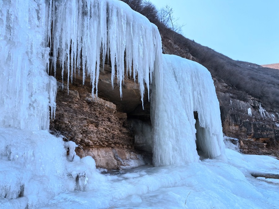 冰瀑是因天氣寒冷,水流到低于零攝氏度的地表后與巖石凍結而形成的一種自然現象。氣溫驟降時,夏日里泉水叮咚的山谷中,卻點綴著一條條銀裝素裹的冰柱,往日流水潺潺的河溪凝結成潔白的“玉帶”在山間舞動,更有寬闊的巨型冰瀑高懸在崖壁之上,讓人感嘆大自然的鬼斧神工。(大佛寺礦 張洋)