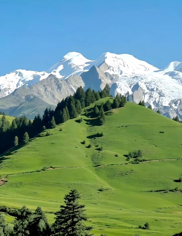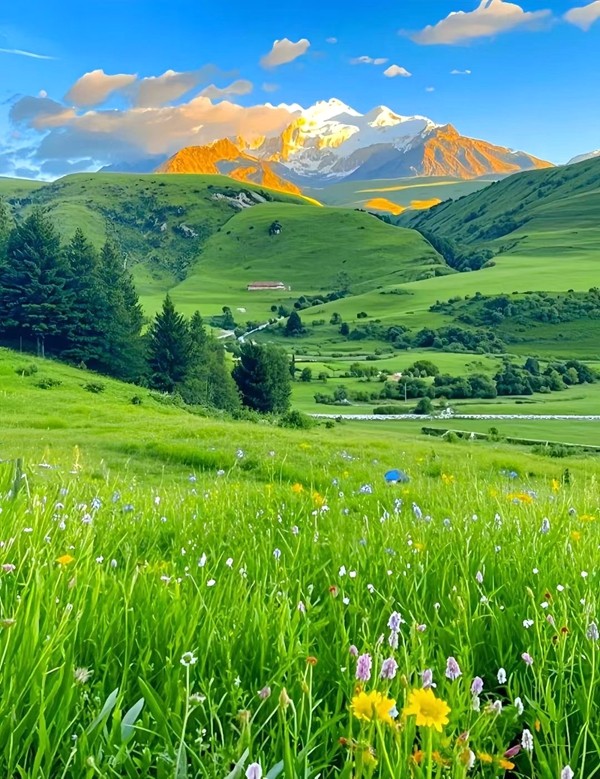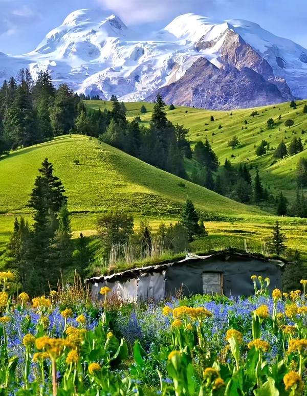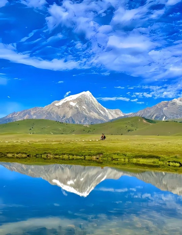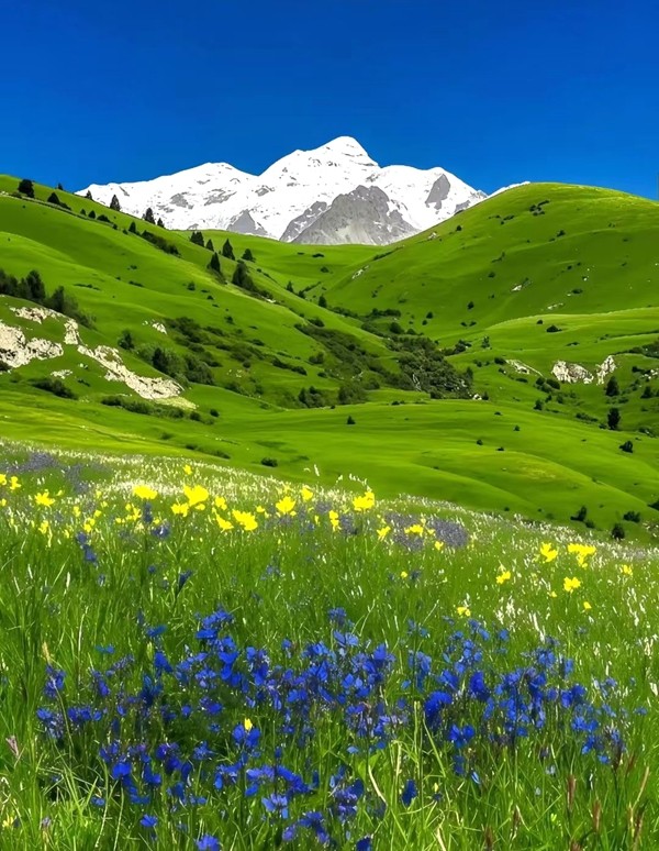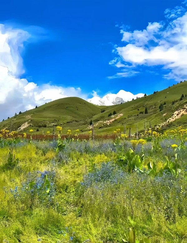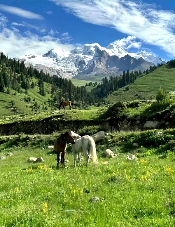 格聶,這座神山矗立于四川理塘,海拔6204米,是沙魯里山脈主峰,藏傳佛教的圣地。進入盛夏,雪山映襯著無邊的花海,冰川融水匯成清澈溪流。草甸似翠緞延展,野花點綴其間,野馬悠閑漫步,如一幅巨美的畫卷鋪展開來。(鄭小楠)